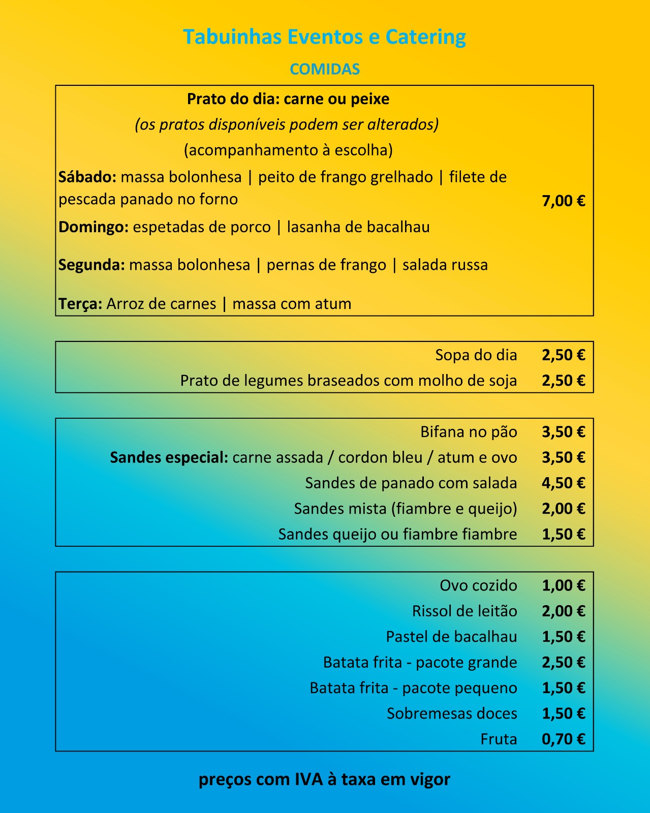 Em cada dia estarão disponíveis vários pratos, bem como acompanhamentos e salgados.